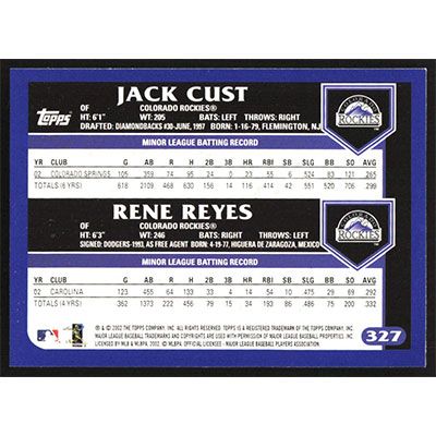 This is a 2003 Topps Jack Cust and Rene Reyes Future Stars baseball card. The card is #327 and pictures show condition.