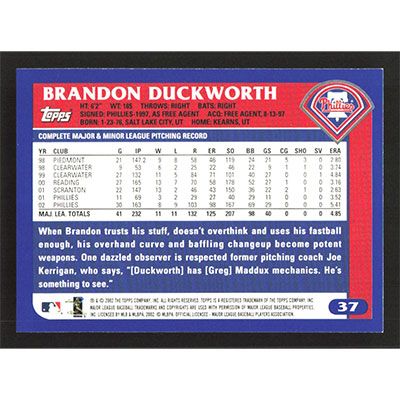 This is a 2003 Topps Brandon Duckworth baseball card. The card is #37 and pictures show condition.