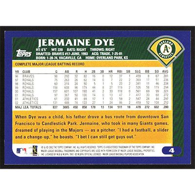 This is a 2003 Topps Jermaine Dye baseball card. The card is #4 and pictures show condition.