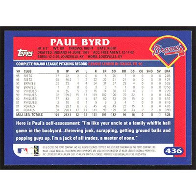 This is a 2003 Topps Paul Byrd baseball card. The card is #436 and pictures show condition.