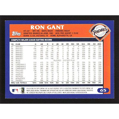 This is a 2003 Topps Ron Gant baseball card. The card is #65 and pictures show condition.