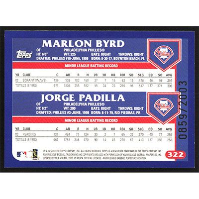 This is a 2003 Topps Gold Marlon Byrd and Jorge Padilla Future Stars baseball card. The card is #322 and pictures show condition. This card is limited; #'d 0859/2003.