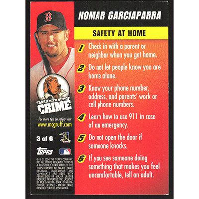 This is a 2003 Topps McGruff Take a Bite out of Crime Nomar Garciaparra Home Safety baseball card. The card is #3 and pictures show condition. Team(s): Boston Red Sox