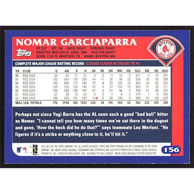 This is a 2003 Topps Opening Day Nomar Garciaparra baseball card. The card is #156 and pictures show condition.