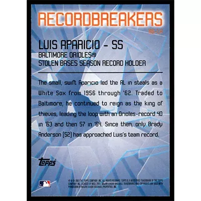 This is a 2003 Topps Record Breakers Luis Aparicio baseball card. The card is #RB-LA and pictures show condition.