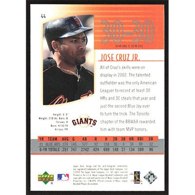 This is a 2003 UD Authentics Jose Cruz Jr. baseball card. The card is #44 and pictures show condition.