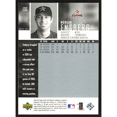 This is a 2003 Upper Deck Morgan Ensberg baseball card. The card is #136 and pictures show condition.