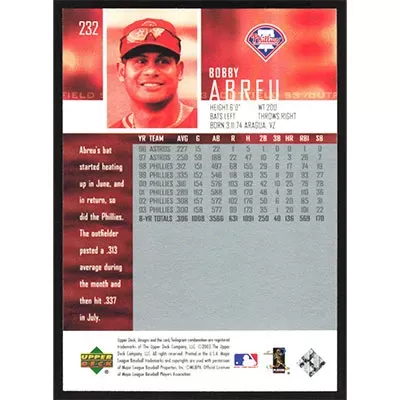 This is a 2003 Upper Deck Bobby Abreu baseball card. The card is #232 and pictures show condition.