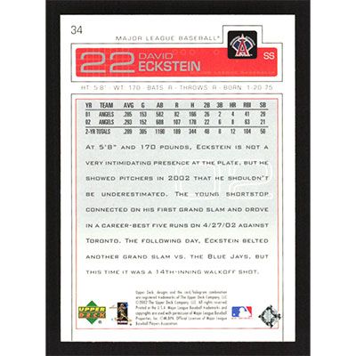 This is a 2003 Upper Deck David Eckstein baseball card. The card is #34 and pictures show condition.