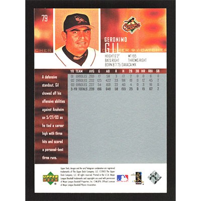This is a 2003 Upper Deck Geronimo Gil baseball card. The card is #79 and pictures show condition.