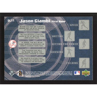 This is a 2003 Upper Deck Big League Breakdowns Jason Giambi baseball card. The card is #BL11 and pictures show condition.