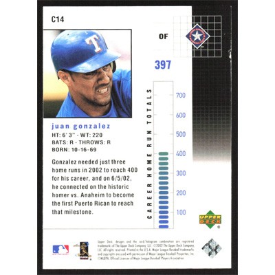 This is a 2003 Upper Deck Chase for 755 Juan Gonzalez baseball card. The card is #C14 and pictures show condition.