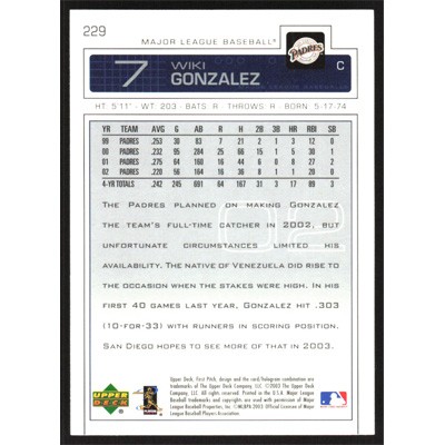 This is a 2003 Upper Deck First Pitch Wiki Gonzalez baseball card. The card is #229 and pictures show condition.