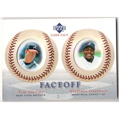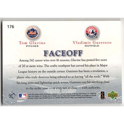 This is a 2003 Upper Deck Game Face Tom Glavine and Vladimir Guerrero baseball card. The card is #176 and pictures show condition. Team(s): New York Mets/Montreal Expos