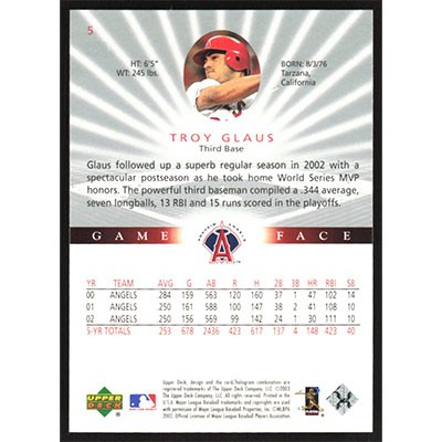 This is a 2003 Upper Deck Game Face Troy Glaus short print baseball card. The card is #5 and pictures show condition.