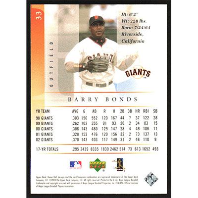 This is a 2003 Upper Deck Honor Roll Barry Bonds baseball card. The card is #33 and pictures show condition.