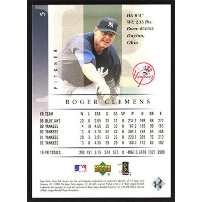This is a 2003 Upper Deck Honor Roll Roger Clemens baseball card. The card is #6 and pictures show condition.