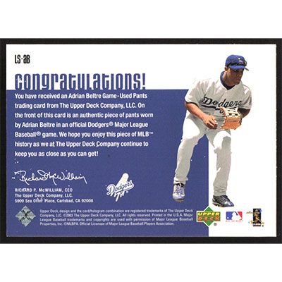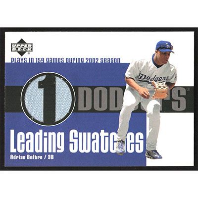 This is a 2003 Upper Deck Leading Swatches Adrian Beltre Jersey baseball card. The card is #LS-AB and pictures show condition.