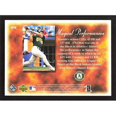 This is a 2003 Upper Deck Magical Performances Jason Giambi baseball card. The card is #MP38 and pictures show condition.