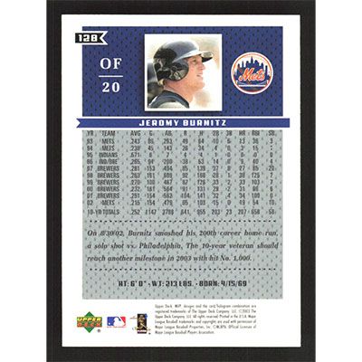 This is a 2003 Upper Deck MVP Jeromy Burnitz baseball card. The card is #128 and pictures show condition.