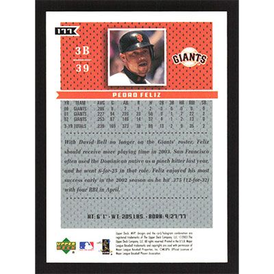 This is a 2003 Upper Deck MVP Pedro Feliz baseball card. The card is #177 and pictures show condition.