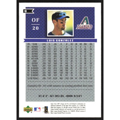 This is a 2003 Upper Deck MVP Luis Gonzalez baseball card. The card is #9 and pictures show condition.
