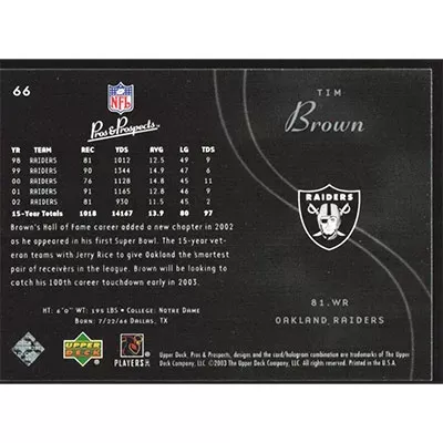 This is a 2003 Upper Deck Pros & Prospects Tim Brown football card. The card is #66 and pictures show condition.
