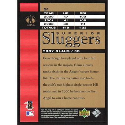 This is a 2003 Upper Deck Superior Sluggers Troy Glaus baseball card. The card is #S1 and pictures show condition.