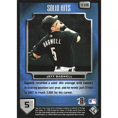 This is a 2003 Upper Deck Victory Jeff Bagwell Solid Hits baseball card. The card is #115 and pictures show condition.