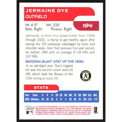 This is a 2004 Bazooka Red Chunks Jermaine Dye baseball card. The card is #194 and pictures show condition.