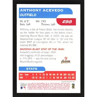 This is a 2004 Bazooka Red Chunks Anthony Acevedo First Year baseball card. The card is #298 and pictures show condition.