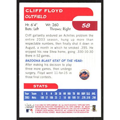 This is a 2004 Bazooka Red Chunks Cliff Floyd baseball card. The card is #58 and pictures show condition.