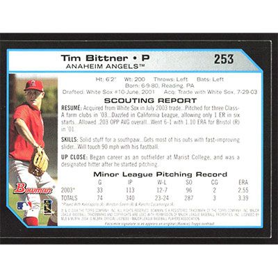 This is a 2004 Bowman Tim Bittner First Year baseball card. The card is #253 and pictures show condition.