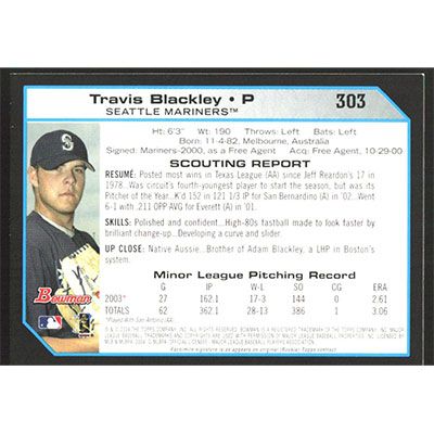 This is a 2004 Bowman Travis Blackley First Year baseball card. The card is #303 and pictures show condition. Team(s): Seattle Mariners Rookie Card (RC)