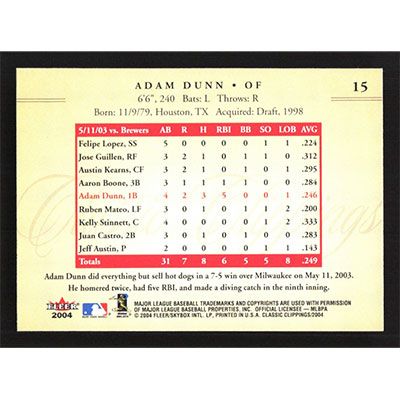This is a 2004 Classic Clippings Adam Dunn baseball card. The card is #15 and pictures show condition.