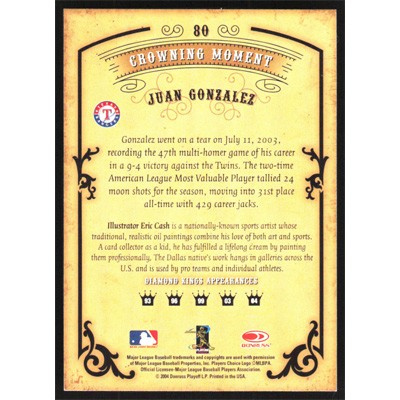 This is a 2004 Diamond Kings Juan Gonzalez baseball card. The card is #80 and pictures show condition.