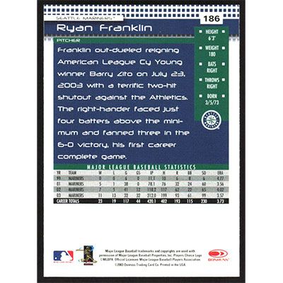 This is a 2004 Donruss Ryan Franklin baseball card. The card is #186 and pictures show condition.