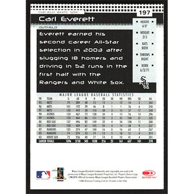 This is a 2004 Donruss Carl Everett baseball card. The card is #197 and pictures show condition.