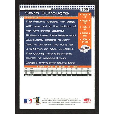 This is a 2004 Donruss Sean Burroughs baseball card. The card is #355 and pictures show condition.