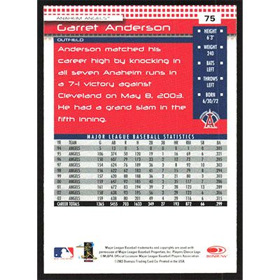 This is a 2004 Donruss Garret Anderson baseball card. The card is #75 and pictures show condition.