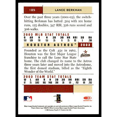 This is a 2004 Donruss Team Heroes Lance Berkman baseball card. The card is #185 and pictures show condition.