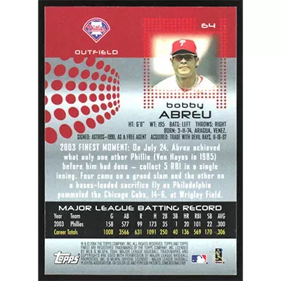 This is a 2004 Finest Bobby Abreu baseball card. The card is #64 and pictures show condition.