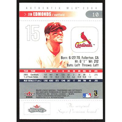 This is a 2004 Fleer Authentix Jim Edmonds baseball card. The card is #10 and pictures show condition.