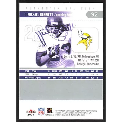 This is a 2004 Fleer Authentix Michael Bennett football card. The card is #92 and pictures show condition.