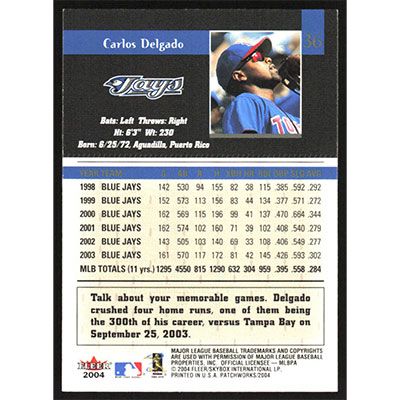 This is a 2004 Fleer Patchworks Carlos Delgado baseball card. The card is #36 and pictures show condition.