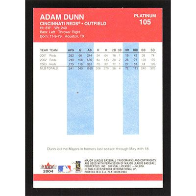 This is a 2004 Fleer Platinum Adam Dunn baseball card. The card is #105 and pictures show condition.