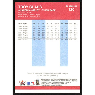 This is a 2004 Fleer Platinum Troy Glaus baseball card. The card is #120 and pictures show condition.