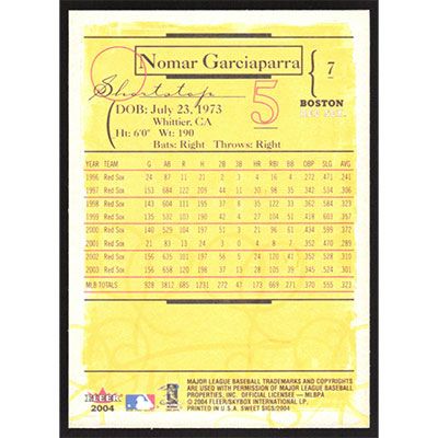 This is a 2004 Fleer Sweet Sigs Nomar Garciaparra baseball card. The card is #7 and pictures show condition.