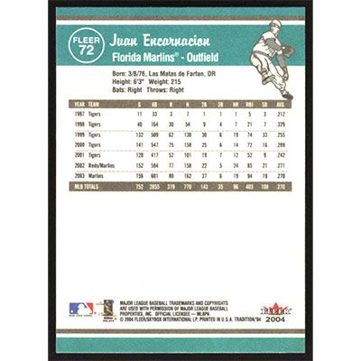 This is a 2004 Fleer Tradition Juan Encarnacion baseball card. The card is #72 and pictures show condition.