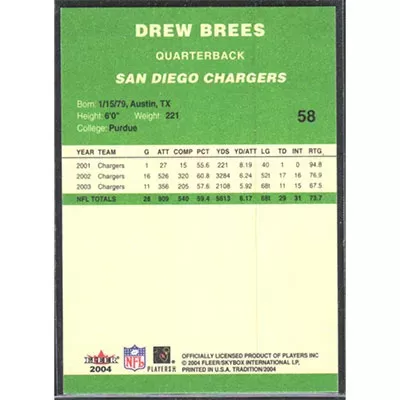 This is a 2004 Fleer Tradition Green Drew Brees football card. The card is #58 and pictures show condition.